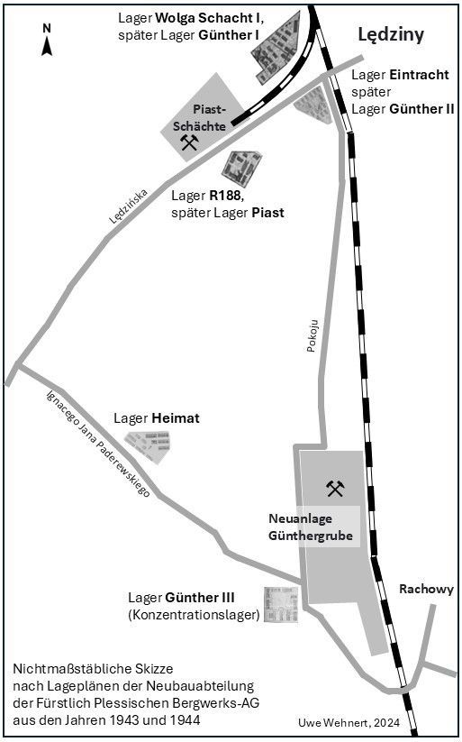 In der Nachbarschaft der Piast-Schachtanlagen existierten ab 1942 mehrere Lager für Kriegsgefangene und Zivilarbeiter: Lager Wolga für sowjetische Kriegsgefangene, jüdische Zwangsarbeiter und später auch Italiener, Lager Eintracht für Zwangsarbeiterinnen und Lager R188 für sowjetische Kriegsgefangene. [39] 1943 erhielten die vorhandenen Standorte im Zuge von Erweiterungsplanungen zur Unterbringung zusätzlicher Arbeitskräfte neue Namen. Am 1. Juli 1944 waren das Lager Günther I (ehemals Lager Wolga Schacht I) mit 484 sowjetischen Kriegsgefangenen und 44 Polen, das Lager Günther II (ehemals Lager Eintracht) mit 221 Polen und 36 Deutschen sowie das Lager Piast (ehemals Lager R188) mit 459 sowjetischen Kriegsgefangenen belegt. [40] Anfang 1943 wurde das Arbeitslager „Heimat“ für etwa 400 Polen, Ostarbeiter und Deutsche eingerichtet. [41] Nahe der Schachtanlage Günther wurde 1944 ein Massivbarackenlager mit dem Namen Günther III (KZ Günthergrube) neu errichtet, das ab Juni 1944 die meisten Zwangsarbeiter aus dem Lager Heimat aufnahm und mit bis zu 1.500 KZ-Häftlingen belegt werden sollte. [42]