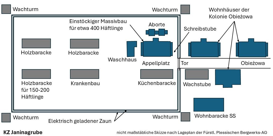 In der Nähe der Grube waren in einem Lager 150 britische Kriegsgefangene untergebracht, die zahlreich Scherereien machten und häufiger die Arbeit verweigerten. [34] Sie wurden daher auf Betreiben der Fürstengrube GmbH am 20. August 1943 abtransportiert und am 4. September 1943 durch 282 Häftlinge aus dem KZ Auschwitz ersetzt, die in demselben Lagerstandort (jetzt KZ Janinagrube genannt) eingesperrt wurden. [35] Die Belegung des Lagers stieg nach Ausbau und Erweiterung auf etwa 900 KZ-Häftlinge an. Für den Einsatz der Facharbeiter mussten ab dem 6. September 1943 6 RM pro Tag und für den Einsatz der Hilfsarbeiter 4 RM pro Tag an die SS bezahlt werden. [36]